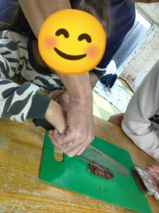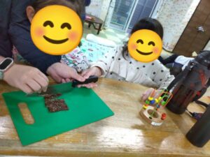 子ども達には、職員と一緒にチョコレートを刻んでもらいました♪
